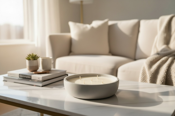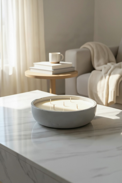 Our concrete vessels are Hand-poured in our Vancouver Island Studio then filled with 32 oz of hand-poured soy. All of our soy bowls come in standard Natural Stone